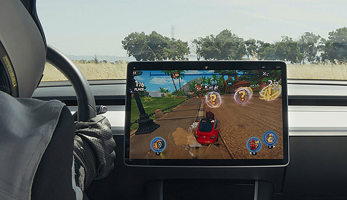 테슬라는 2018년 가을 출시된 '모델 3', '모델 S', '모델 X' 의 최신 소프트웨어 업데이트와 함께 대시 보드 상단의 대형 디스플레이로 레이싱 게임을 즐길 수 있도록 했다. 차량을 안전한 장소에 주차 한 다음, 대시 보드의 대형 디스플레이로 게임을 플레이 할 수 있다.
