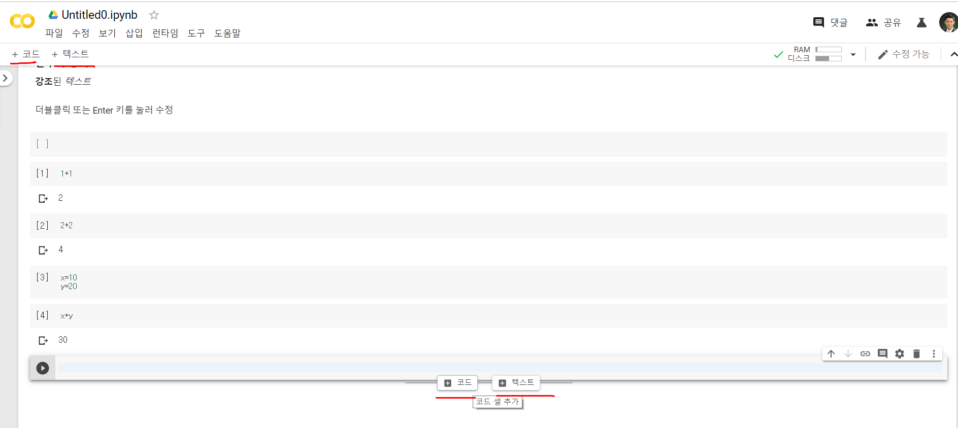 2. 텍스트 혹은 코드 추가하기