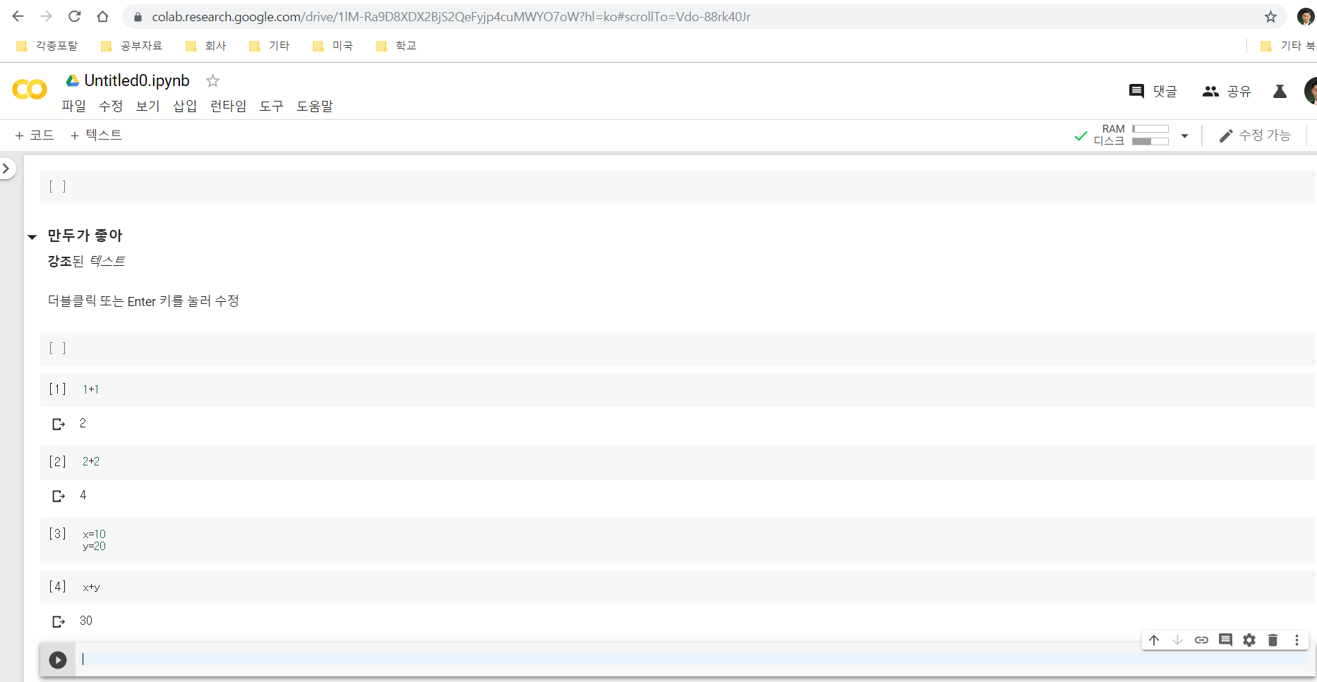 3. 텍스트 입력 혹은 코드 입력하기 (단축키 : shift + enter)