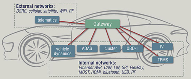 - 차량 내부의 각 부품들과 ECU 모듈 간의 정보 교환을 위한 차내 망(IVN, In Vehicle Network)과, 교통 신호 및 서드 파티 서비스 센터 연계를 위한 외부 통신망(OVN, Outbound Vehicle Network) 소프트웨어를 지칭