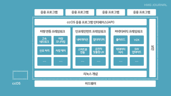 - 현대차는 리눅스를 기반으로 커넥티드 카에 최적화된 독자적인 차량용 운영체제인 ‘ccOS(connected car Operating System)’를 개발 중