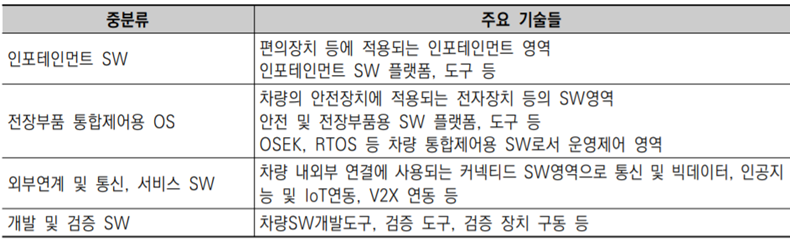 - 이처럼 소프트웨어는 자동차에 있어서 매우 중요한 요소. 차량용 소프트웨어는 기능별로 크게 다음과 같이 분류. 각각에 대해서는 아래에 설명