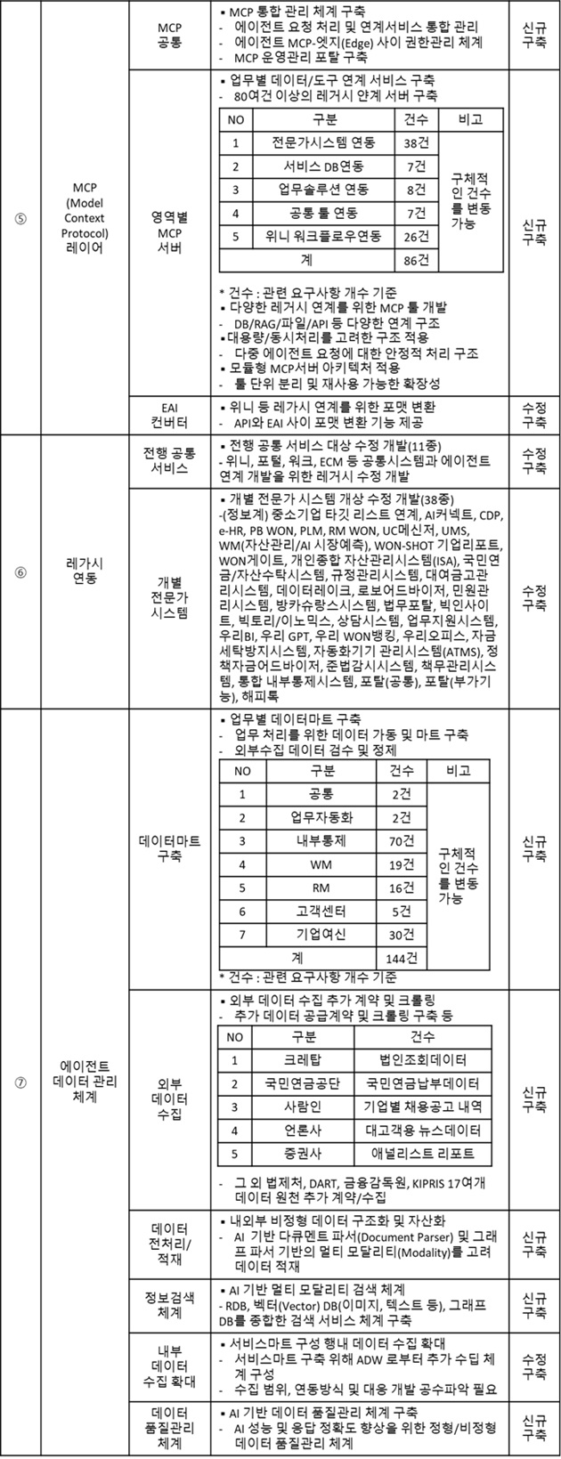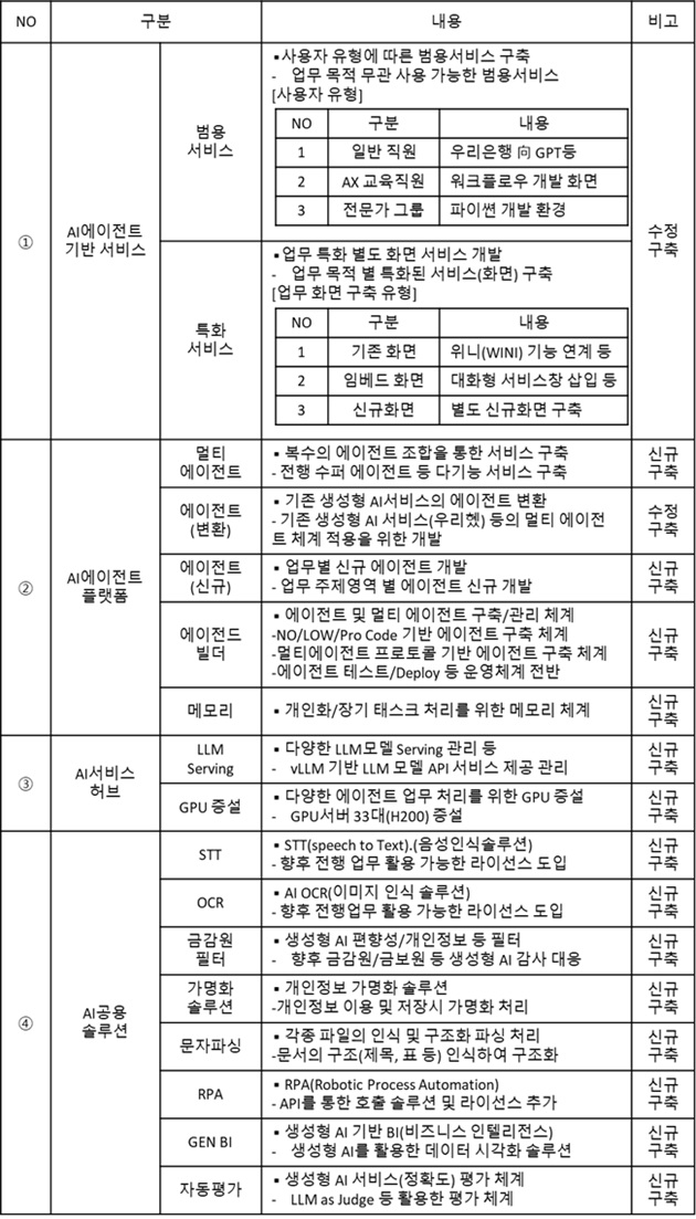 지난 5일 우리은행(은행장 정진완)이 발주한 ‘AX를 위한 AI에이전트(Agent) 구축’ 사업의 ‘AI 에이전트 시스템’ 개발은 ▲AI에이전트 기반 서비스 ▲AI에이전트 플랫폼 ▲AI서비스 허브 ▲AI 공용솔루션 ▲MCP(Model Context Protocol) 레이어 ▲레거시 연동 ▲에이전트 데이터 관리체계 등 총 7개 부문 개발 범위로 확인됐다.
